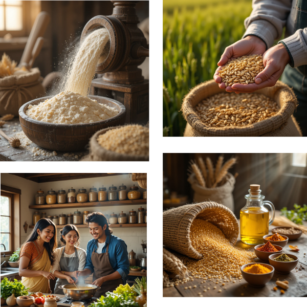 At Alokam Sattvam, we believe food is more than just nourishment — it is a connection to tradition, purity, and family well-being. Rooted in the values of honesty and authenticity, our journey began with a simple vision: to bring back the goodness of natural, stone-ground flours and Expeller pressed, filtered oils to every Indian home. Every product we create carries our promise of purity made visible, crafted with care to keep your family healthy and connected to India’s rich food heritage.